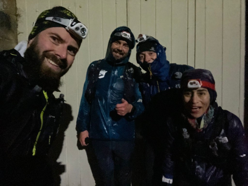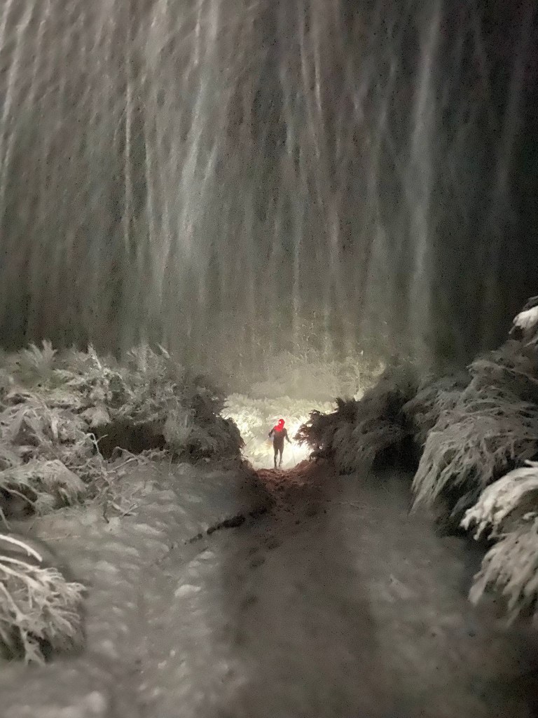 We stopped at the bottom of the hill to put our torches on and eat. I realised I had also been close to bonking a bit for a while. I hadn’t eaten enough. My last waffle had frozen completely (that was a new one!) but I found a gel and some more chews, this I felt would get me through. We now had about 10km to go which would normally be easy right, how wrong we were! The blizzard intensified as we climbed up another hill, this time though it was right in our eyes, horizontal pellets in your face. It made the going really slow as we had to keep a hand up to protect our eyes. I was cursing not bringing my clear glasses and so was Yvette. She was also suffering from a kit issue on her jacket. It was giving her zero, side protection for her face and her neck buff was completely frozen. This was the toughest running conditions I have ever experienced weather wise. The Gore-Tex gloves were starting to buckle under the pressure. We all longed to have the wind behind us and every so often we would get little rest bites from dipping into a sheltered section where the snow running was fun. Even when I fell over it was pretty enjoyable but then we would be back out in the blizzard again.