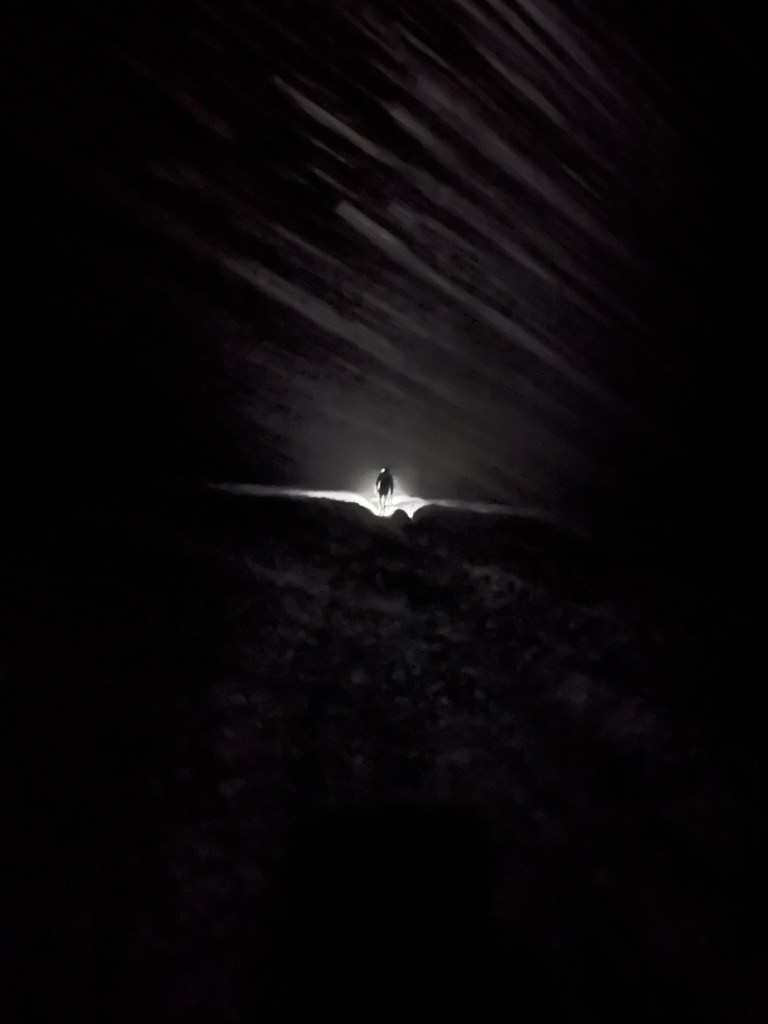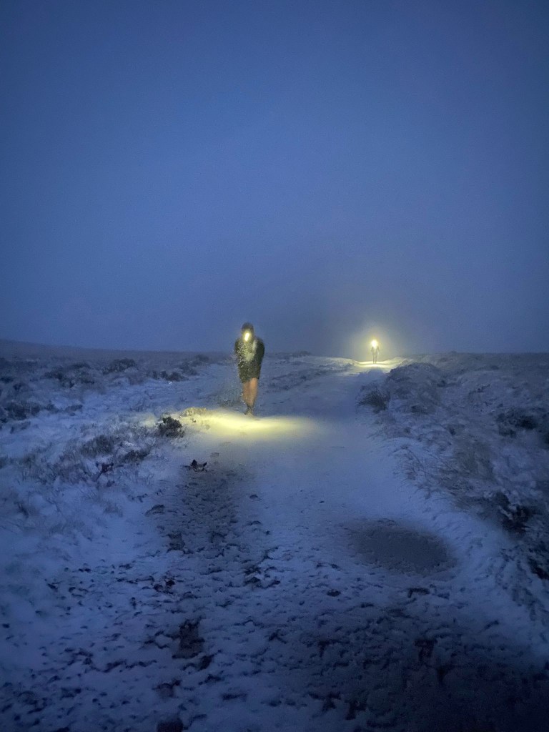 The path down was interesting! The snow was getting a bit deeper and more compact. The bogs were hidden but the footsteps of the other runner were easy to track. You drop 600m in 5km which should have been the most fun but this is where I had a kit fail! My trusty gaiters, which had kept the mud out of mud shoes for all this time started gathering ice balls on the string that runs across the sole. I have had this once before but forgot about it. Basically, the snow freezes on the string and then compacts as you run creating a ball of ice that grows and grows until you can’t run. I tried stopping to knock it off on the right foot with my poles but it just wouldn’t work so eventually I just sat in the snow and undid each string strap. Cursing the time it was taking and holding the others up. I couldn’t even get the ices balls off so just had to tuck them under the gaiters. Back on my feet though, I soon found the joy again but the blizzard was getting stronger and the light was failing fast.