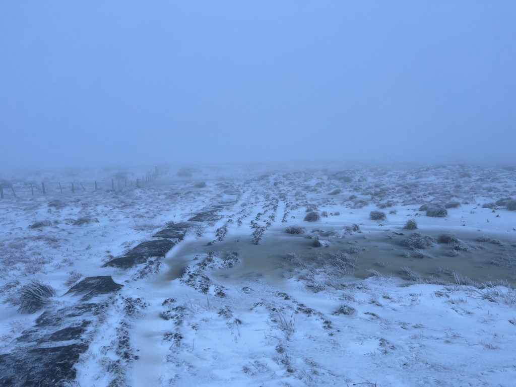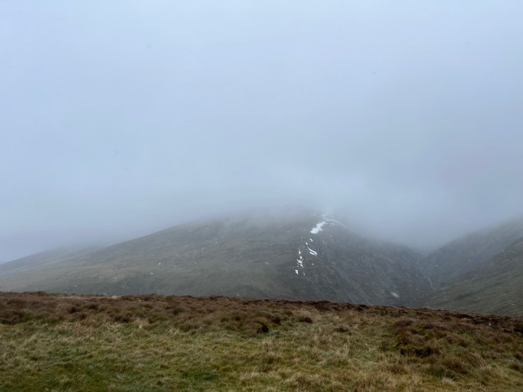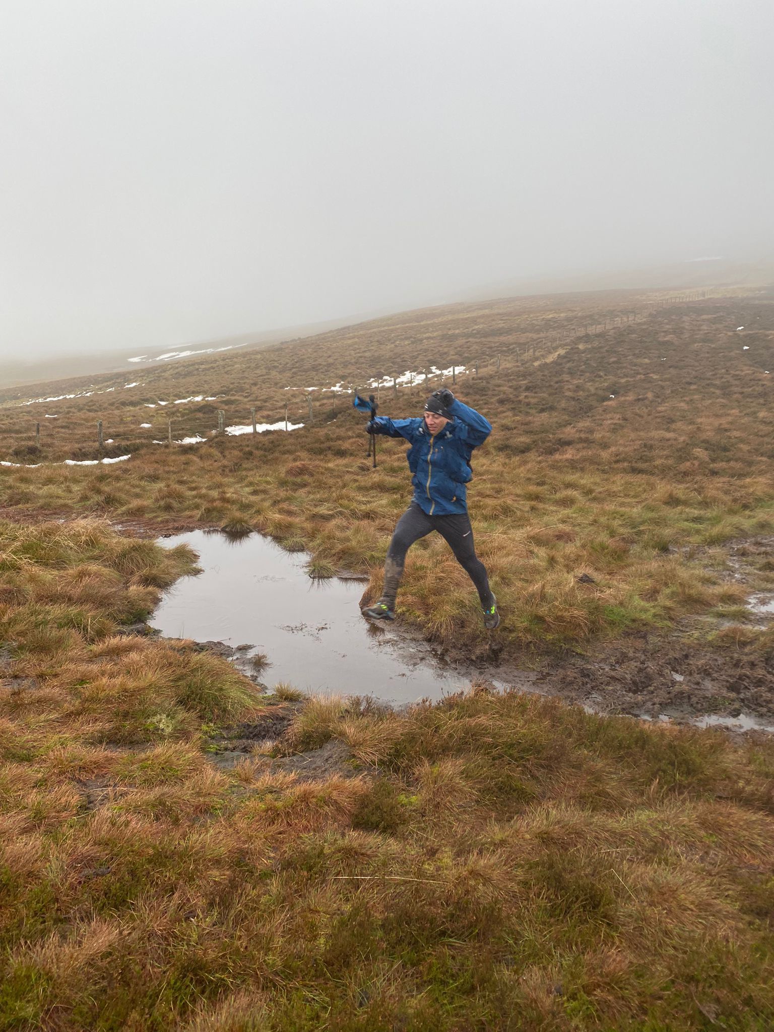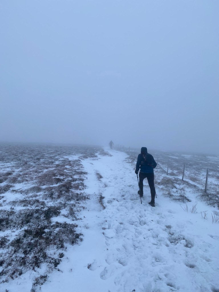 Back up the road again we went. This time though we took the alternative route on the Pennine way via Halterburn and Burnhead. It starts on road then soon became open fell again and is just up, up and up. The warm gloves and poles came out and it was time to get my power hike on as the sun was hidden by clouds now. We saw our first glimpse of snow remaining from the past week as the temperature got cooler and the path got boggier. We re-joined the Pennine way proper and started the climb up the Schill. At this point the mist turned into light rain, so as soon as we summited those that didn’t have jackets on (like me), soon put them on. The Sleet started turning to snow. This section of the Pennine way was pretty boggy and going was slow but we were enjoying it honestly. Knowing this is what the race would have been like was good for us mentally. Dai went in up to his knee once, I did some comedy jumps, Paul skipped around and Yvette did a mix of it all. A little while earlier we had run into Fergy and his friends who were supposed to have been in the race also but were now doing the marathon route in the opposite direction. They warned us that the weather up on The Cheviot was pretty wild and we should layer up. Just before the start of the climb there was a very handy hut offering shelter from the snow. I personally felt pretty good in my layers as they were. The Gore-Tex jacket doing its job well. The others all added another base layer, while I danced around, another non racer came past us and started heading straight up without stopping. I looked up at the climb thinking damn that steep, it was about avg 30-35% gradient. 250m+ in 1.2km, so yeah fairly punchy. After food we all started the ascent. It was tough going in the cold. Paul pushed on and I tried to keep up lol! 20mins later we were all super excited to have reached the Cheviot summit, we took photos and videos celebrating then headed off trying to keep warm.