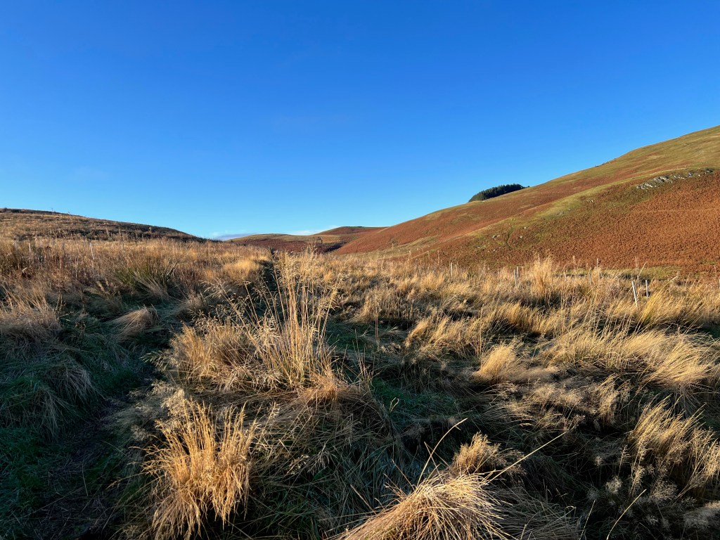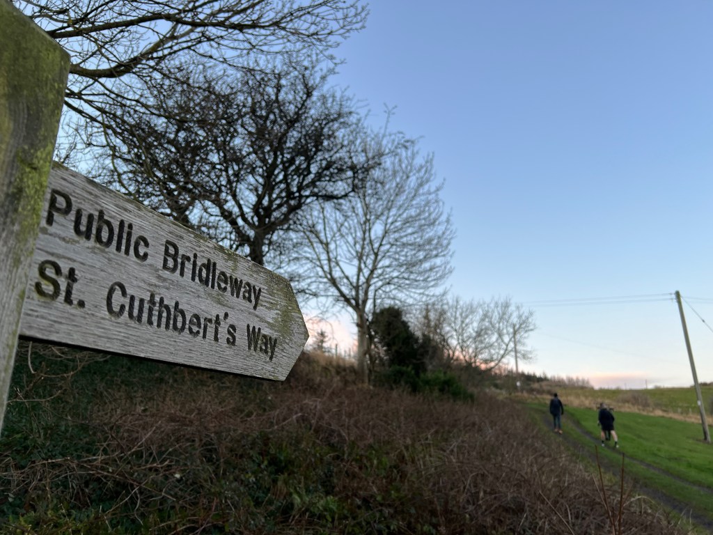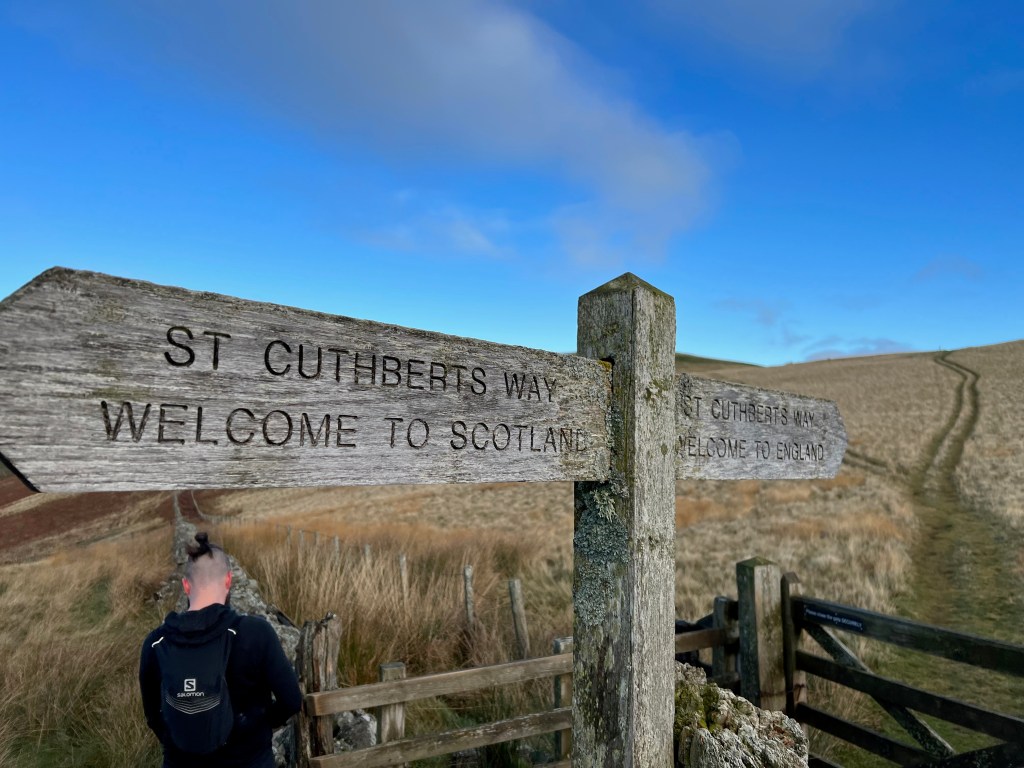 We headed up the road out of Wooler ready to tackle the route counter clockwise. We were soon on the St. Cuthberts Way trail but also, soon seeing the damage from the storm up close and personal as our way through some pine woods was totally blocked. We tried a different path but that was also impassable. A little OS jiggery pokery, a corner cut and we were back on track, remembering that later we would have to avoid those woods on the loop back!. Up on the open fells it was glorious, the sun shining low, the frosty feel in the air. This we said, would be the perfect way to start race day. This route didn’t go over many of the surrounding hill tops at this point but the course was nicely undulating. It did give us the opportunity to witness dai pee many times, slip in into a few shallower bogs and learn about why some of the paint markings on sheep are on the Ewes backs! Google that as I genuinely thought Dai and Paul were making it up. The thing we were most excited about was crossing the border into Scotland. As we got closer, we took a little diversion up a hill to get a nice view across the border and to where we would be heading later! Life was good, it was getting a bit cooler, and hats were on before we crossed the famous fence and joined the Pennine way. Of course, Dai had to stop for a wee on the border line as we took photos of the sign.