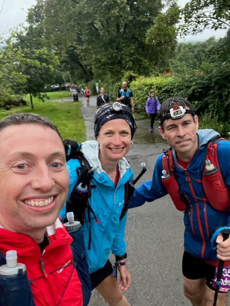 Well, well, I didn’t really look at the final section did I, lol. Its straight up on “Jacobs ladder” as its known as. So 300m in like 3km. The poles were out again and I was ready to kick ass. So much so I kinda just pushed on and left the others…sorry Ally and Andy. It was really good to still have my rhythm though, up through the rocky streams I went. Then there was a bit of a scramble to do, which was fun, I am so much more confident on these since my adventures this year. It was then that I noticed I had left the others so stopped to make sure they would be ok and it was only a couple of mins before I saw Ally come over the scramble saying something like “that was interesting”. I kept to a more easier pace for the rest of the climb and as it levelled out we waded though some deep stream crossing and passed a lot of amazing sounding waterfalls. It would be fun to come up here in the light to see them once day but for now, we really just wanted to get moving and finish. Down hill it was though, not the easy kind of course. Steep rocky lakeland downhill. Some bits I could run and others 100% not. My feet had started hurting from all the rocks, not really bad but I noticed that ultra pain of having been on my feet a while and them getting wet and dry and wet again for the last few hours. When we finally got to a more runnable section, Ally and I managed open up a bit, which was fun, then it became almost road, we slowed a bit and Andy caught us back up. He had that finishers wind now. I think at some point it almost stopped raining too but our minds were just not he finish line. Into the village we came to muted cheers from the volunteers (it was late) and we were directed to the finish, Ally sped ahead as we rounded the corner to the lane which would lead to the school. There were quite a few people out cheering us in, it was an awesome feeling to finish another Lake District race.