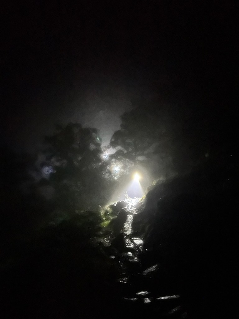 I had forgotten two things, one this side is really, really rocky (I know this form running int he Langdales) and two I hadn’t recced or watched videos of this section. We were soon off the flat lands of the valley floor and traversing round the side of a hill that was pretty much un runnable, also it was getting wetter and wetter as the rainfall from the last 24 hours was working its way down to the lower paths. We then had the short but steep climb up to Blea tarn, which was punchy but I was still doing well on these. Andy, was starting to struggle a bit more though. Then it all gets a bit hazy but there was an unmanned CP (which you just have to pass by) and a lot of paths as rivers and bouncy/muddy bogs. it was at this point, I was like, ahhhhh ok, so this is the sting in the tail people talk about. Rocks combined with water and darkness makes for a very special kind of lakeland hell/fun. When i could run, I would but it wasn’t that often. Suddenly this whole “we’ll be done by 12.30ish” was looking quite impossible, so we just accepted what would be would be. Ally did ask me if this was normal and I said, well yeah if it rains, the paths all become streams, so we just rolled with the punches to get to the final CP.