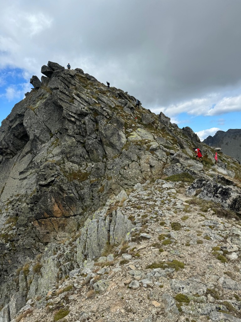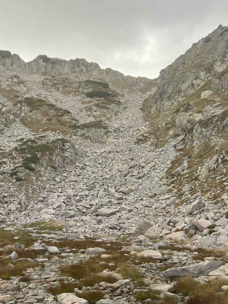 I headed out and up, the poles came out soon after as it was now getting steeper. To be honest the rest of this climb is a little hazy in my memory. I know I felt good, there we’re some beautiful parts with little pools of water, a river, passing some hikers heading out early from a refuge giving us all thumbs up and saying “Respeck”. Then at some point the rocks and boulders started, there were no switchbacks, the climbing was direct and steep. It was hard, hands were needed. I just focussed on one step at a time, climb strong and with purpose. Then I popped up at the top and of course there was a photographer there, in fact it was the only one I saw all day.